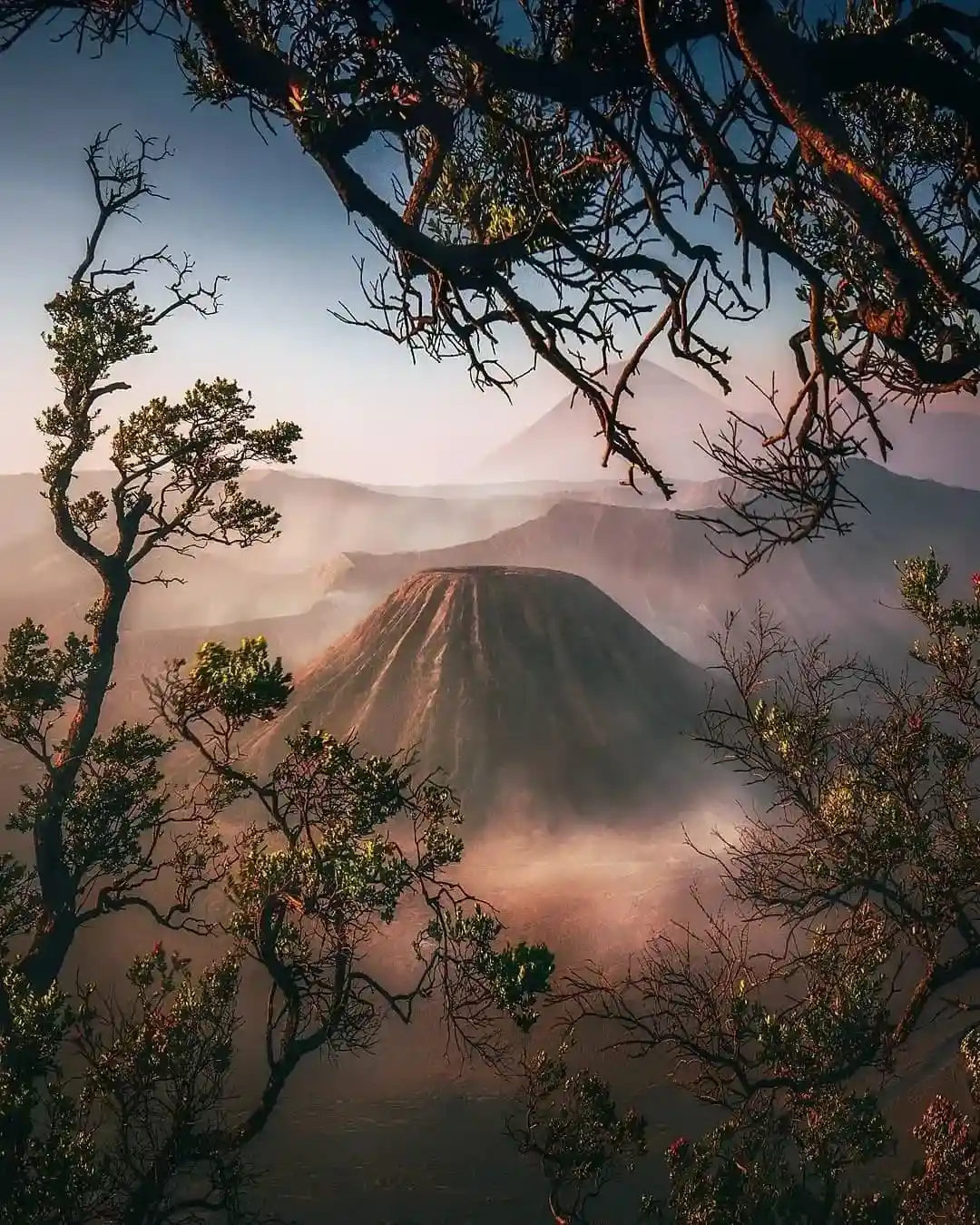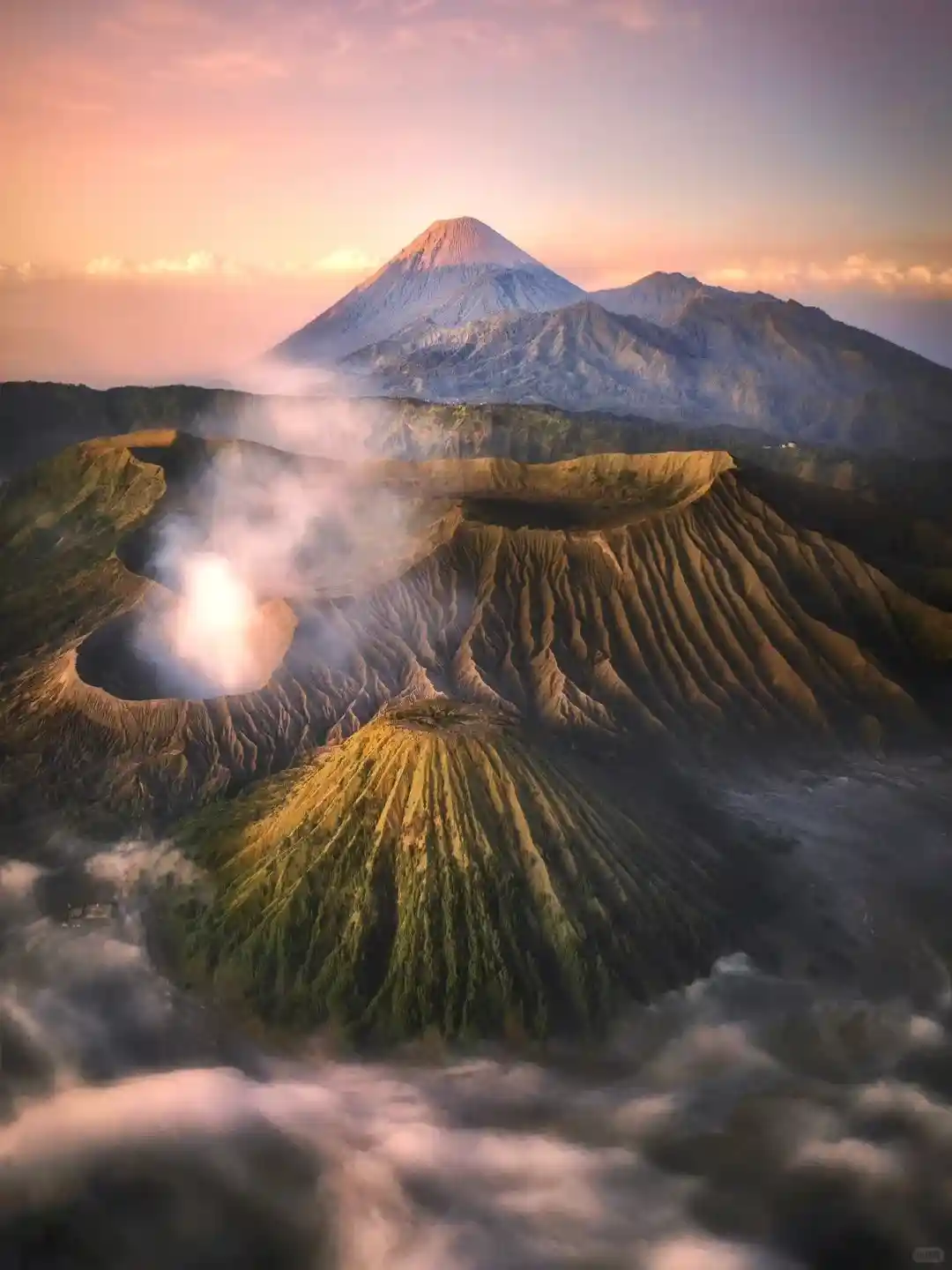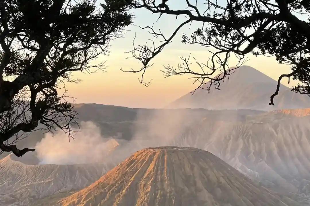 日出时的布罗莫火山在晨曦的挥洒下如梦似幻