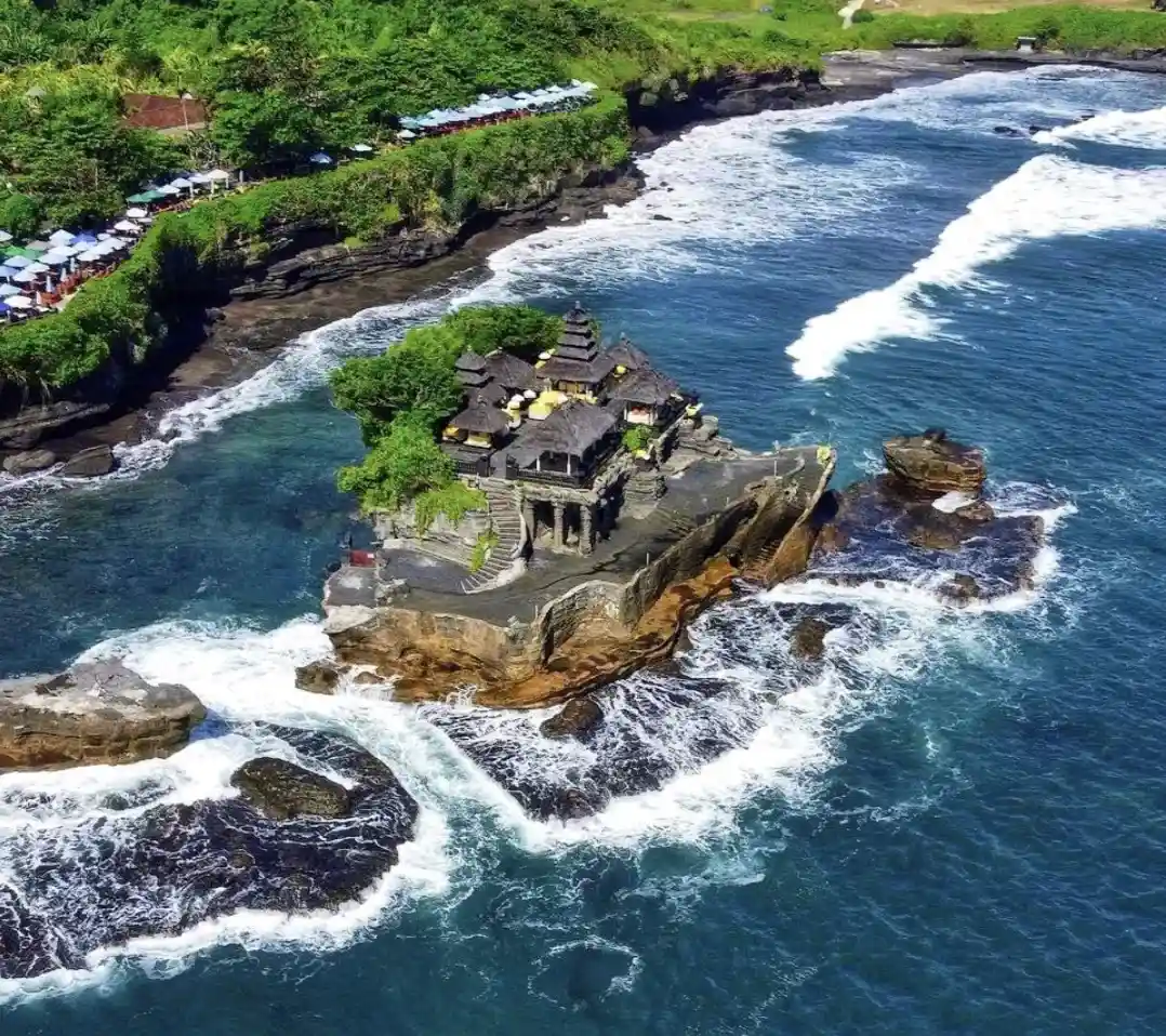 14:00-15:00--游览【海神庙-Tanah Lot】(游览1个小时),意指海中的陆地是印尼巴厘岛中西部海岸的一座寺庙,盖在一个经海水冲刷而形成的离岸大岩石上也是峇里岛六大寺庙之一。此庙灵气汇集,为难得圣地,当地居民建议之下在此立了此庙。海神庙名称的由来,据民间传说,底座的海蚀洞里,曾经出现过几条黑白分明似雨伞节的海蛇,当地人认为这是海神的化身,来保护庙宇及人民,自此,海神庙里终日香火缭绕,虔诚的村民络绎于此。