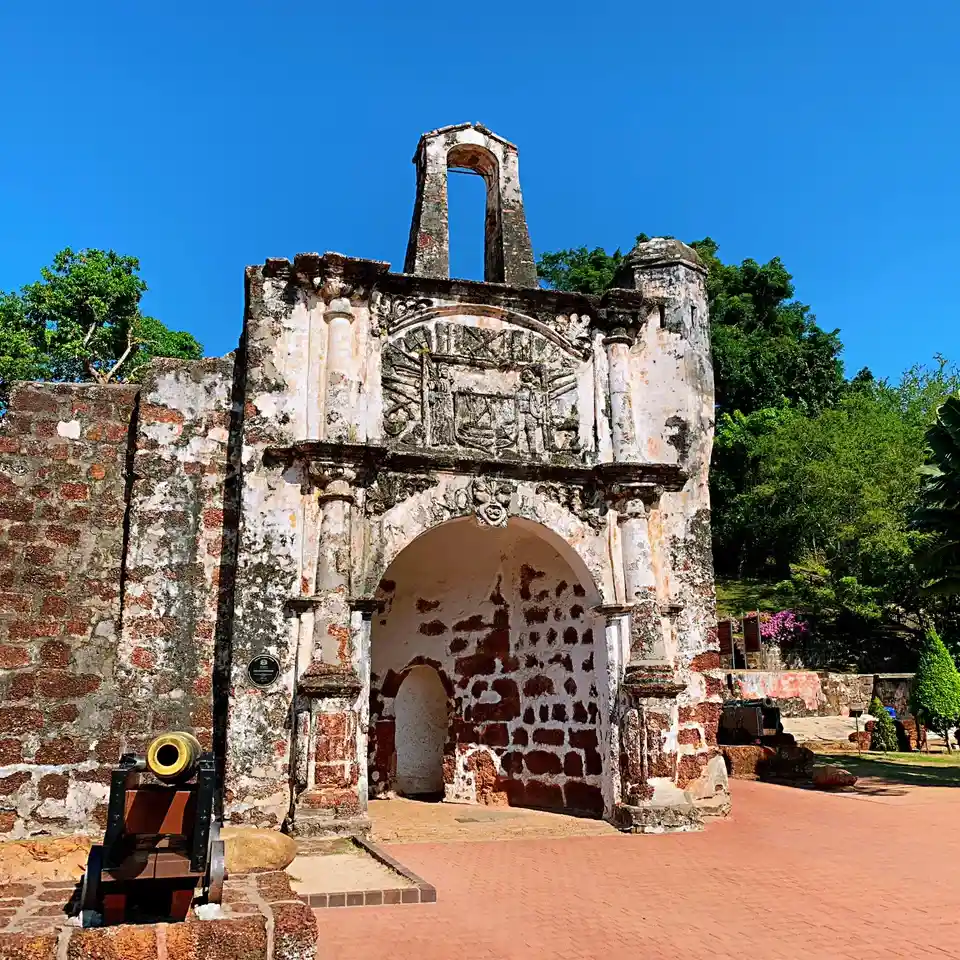 【圣地亚哥城堡】该城堡是马六甲的必看景点和拍照留念地之一,它是葡萄牙人在 1511 年修建的一座要塞。 该城堡为 16 世纪初期的葡式建 筑物,号称东南亚较大和较坚固的城堡。该城堡是葡萄牙人于 1511 年占领马六甲后所建,1607 年城堡被荷兰人炮轰破坏,仅有城门幸存。 城 堡被当地人视为马六甲的精神象征。由此可以俯望马六甲市、旧港口及马六甲海峡。