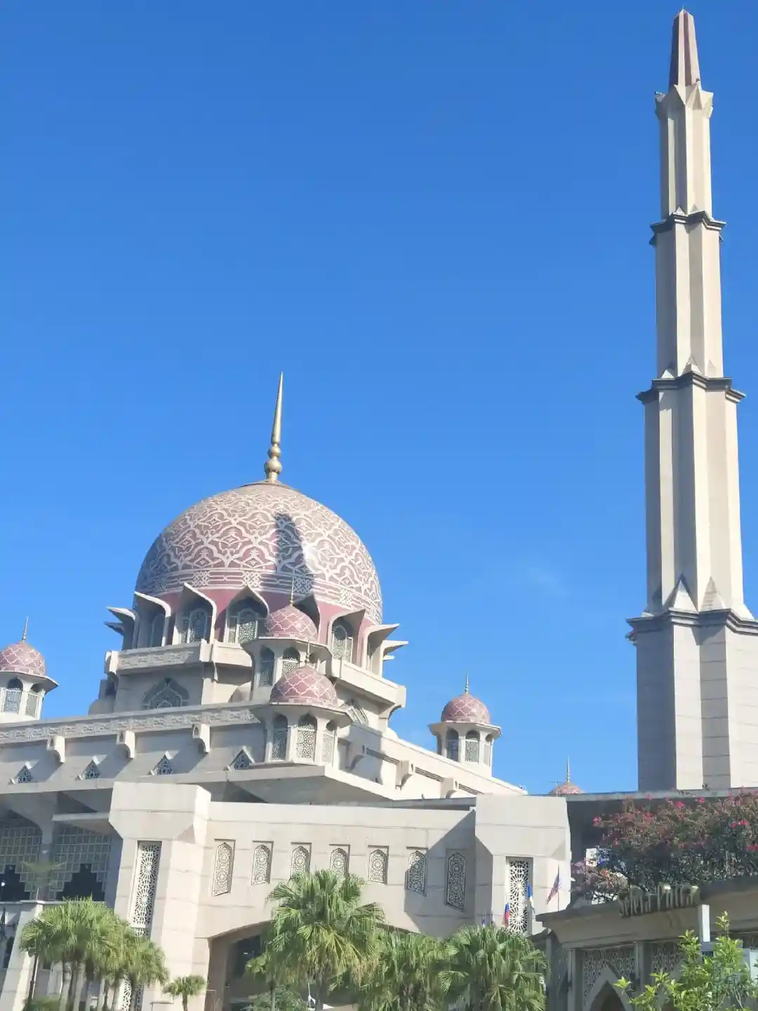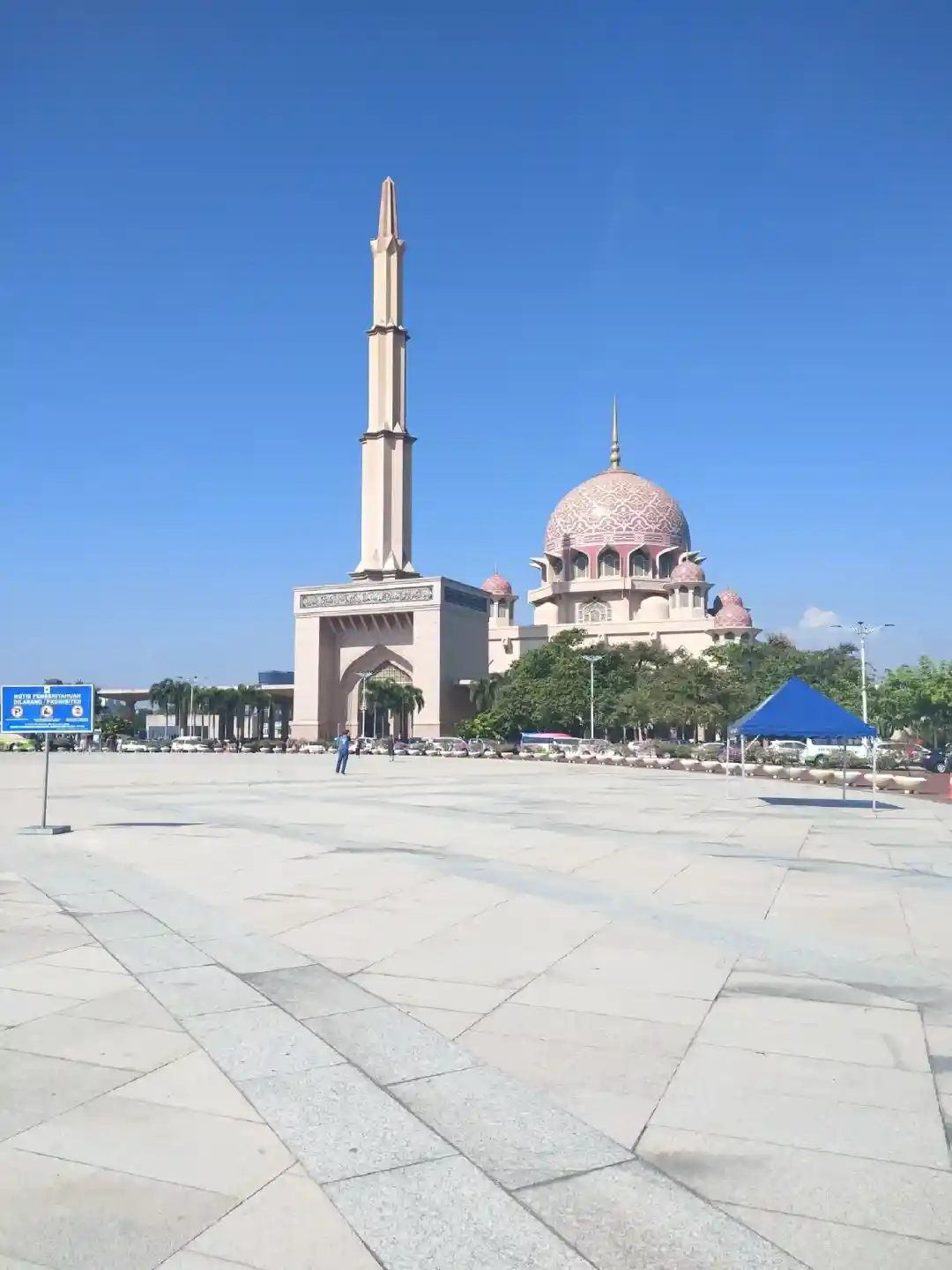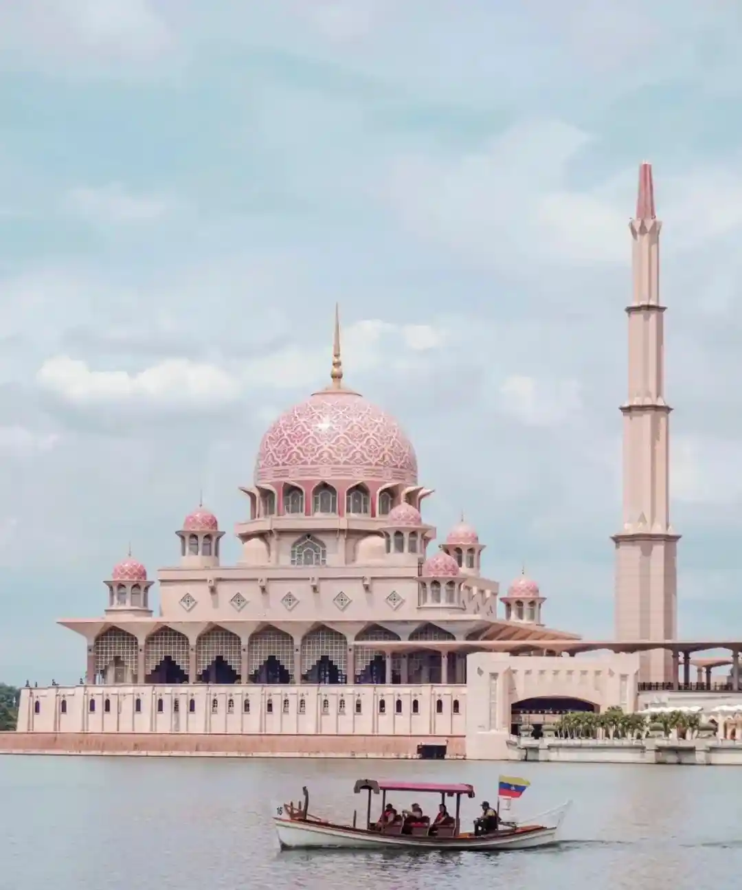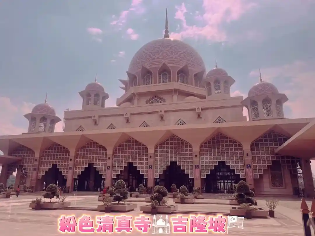 【粉红清真寺】(外观)太子城广场侧面是水上清真寺的全貌。这座四分之三建于湖面上的水上清真寺可以同时容纳一万两千人在此做礼拜。 它为上下两层,二楼供四千名女子专用,楼下为八千男子使用。每当做礼拜时,清真寺那高高的宣礼塔内播放的古兰经声悠扬地萦绕在清真寺 的上空十分悦耳。