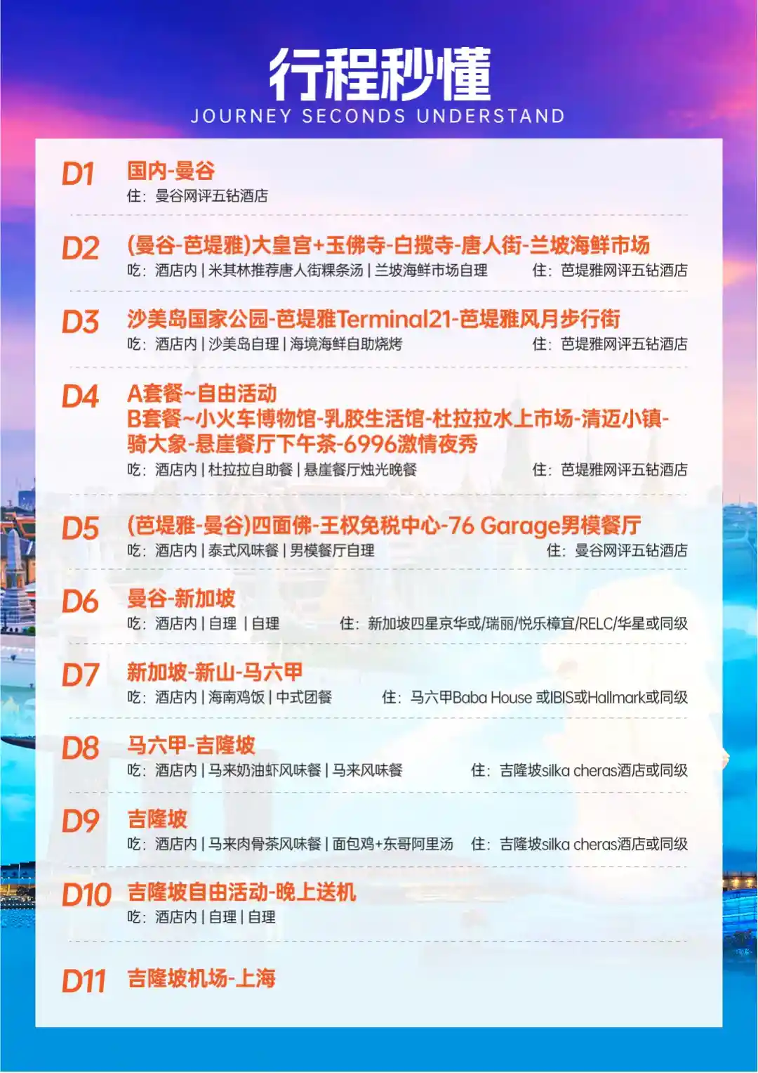 大皇宫+玉佛寺(约90分钟),白揽寺(约60分钟),唐人街(约60分钟),兰坡海鲜市场(约90分钟),曼谷-芭提雅(约120分钟)