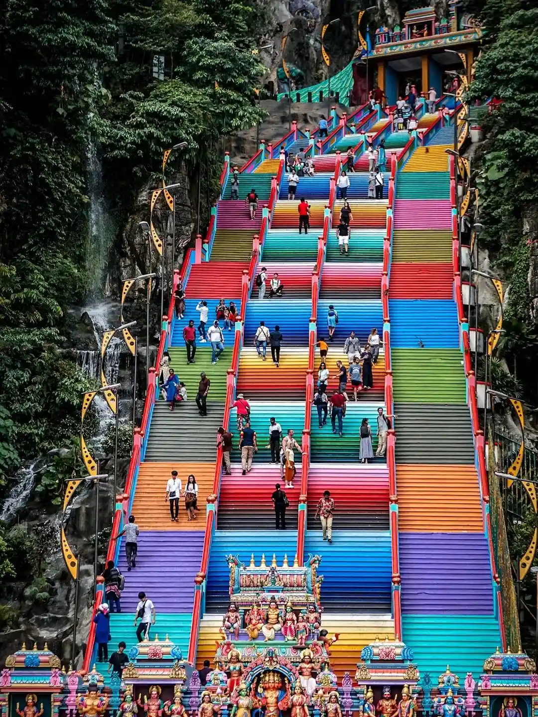 【网红七彩阶梯——黑风洞+MURUGAN 神塑像】印度教朝拜圣地,这里处在丛林掩映的半山腰,是一个石灰岩溶洞群,需要步行 272 级陡峭台 阶而上。黑风洞前面矗立着一座 140 英尺高的镀金印度大佛战神穆鲁干(Lord Muruga)的巨大塑像。这里是世界上最大的宗教节庆活动之一 马来西亚大宝森节主要的节庆场所。这里也是吉隆坡的新一代网红景点, 七彩斑斓的阶梯,如同马来西亚多元文化的碰撞。
