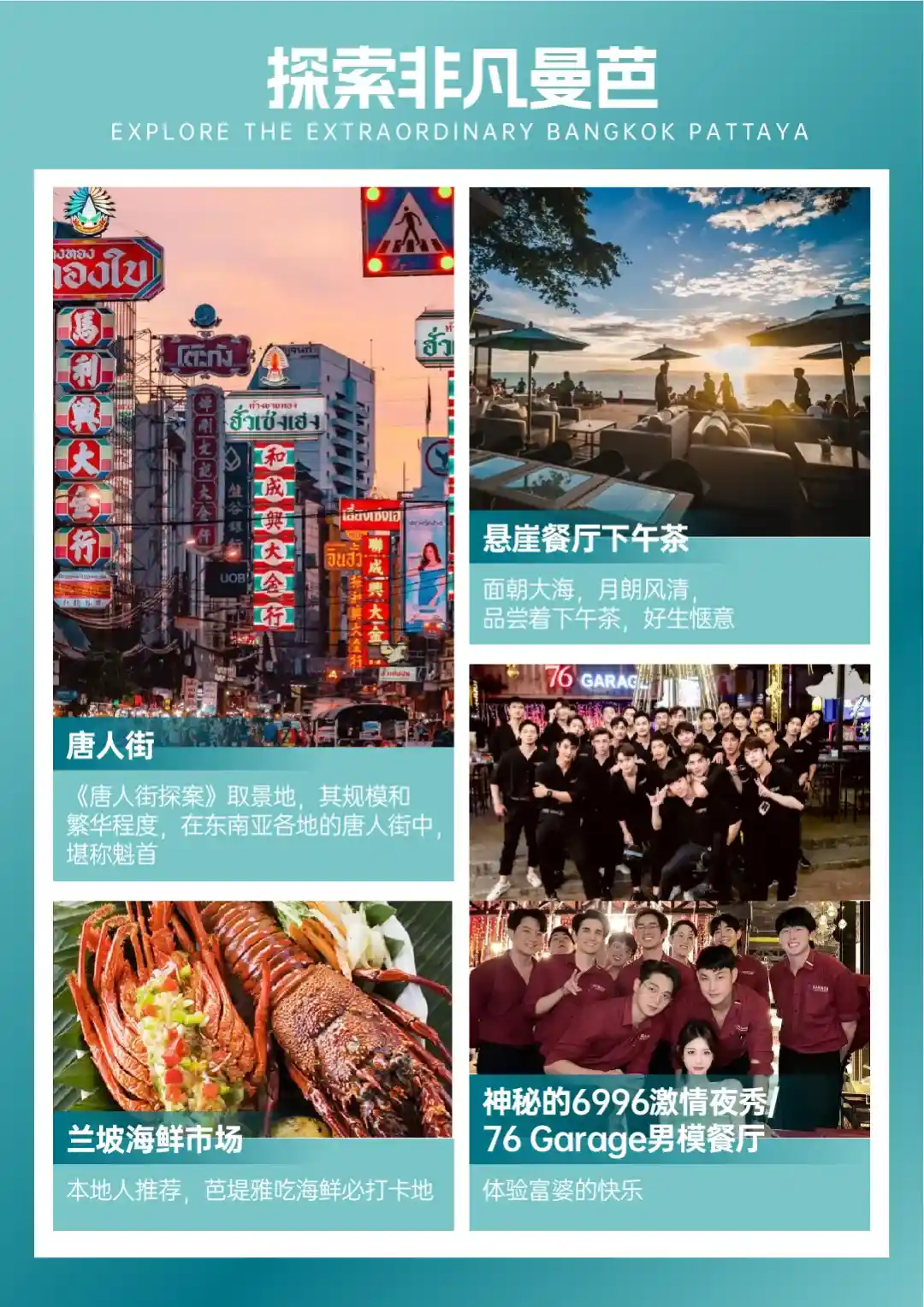 四面佛(约60分钟),KingPower免税店(约90分钟),76 garage男模餐厅(约90分钟)