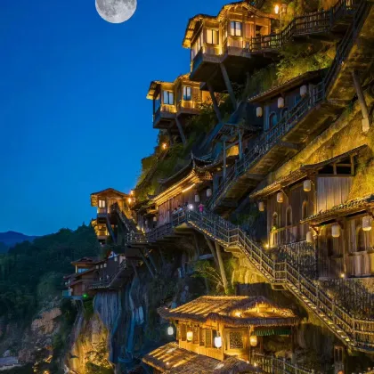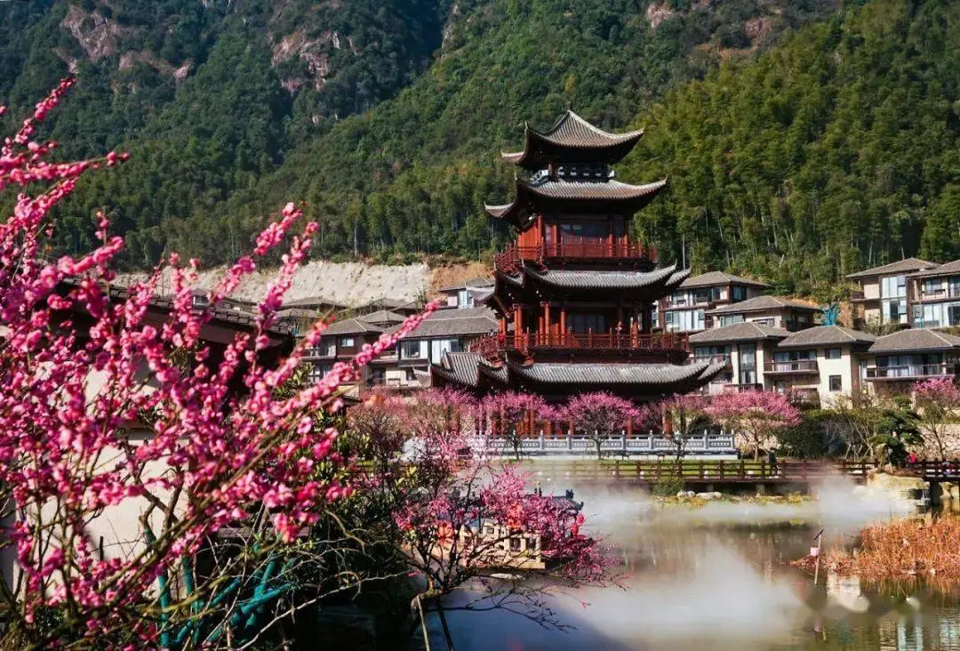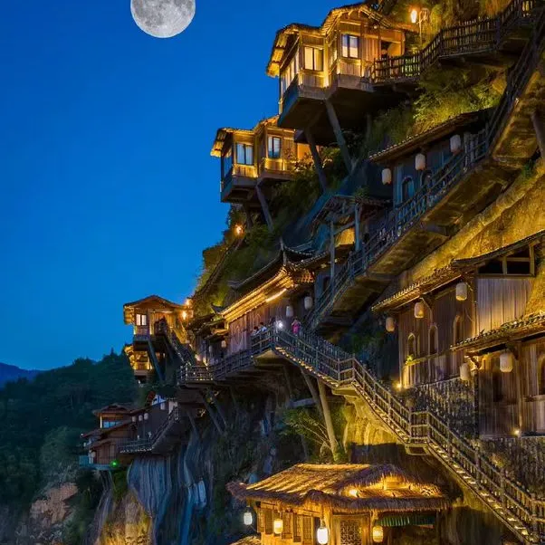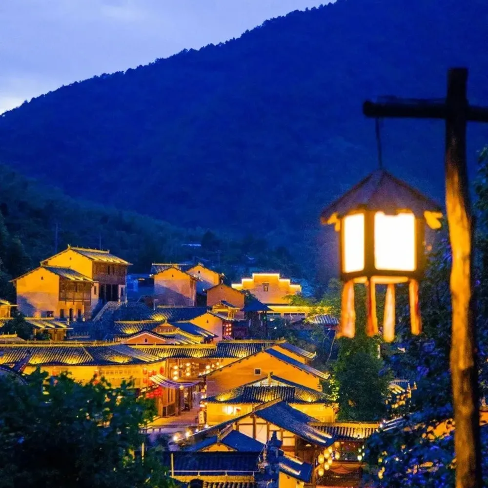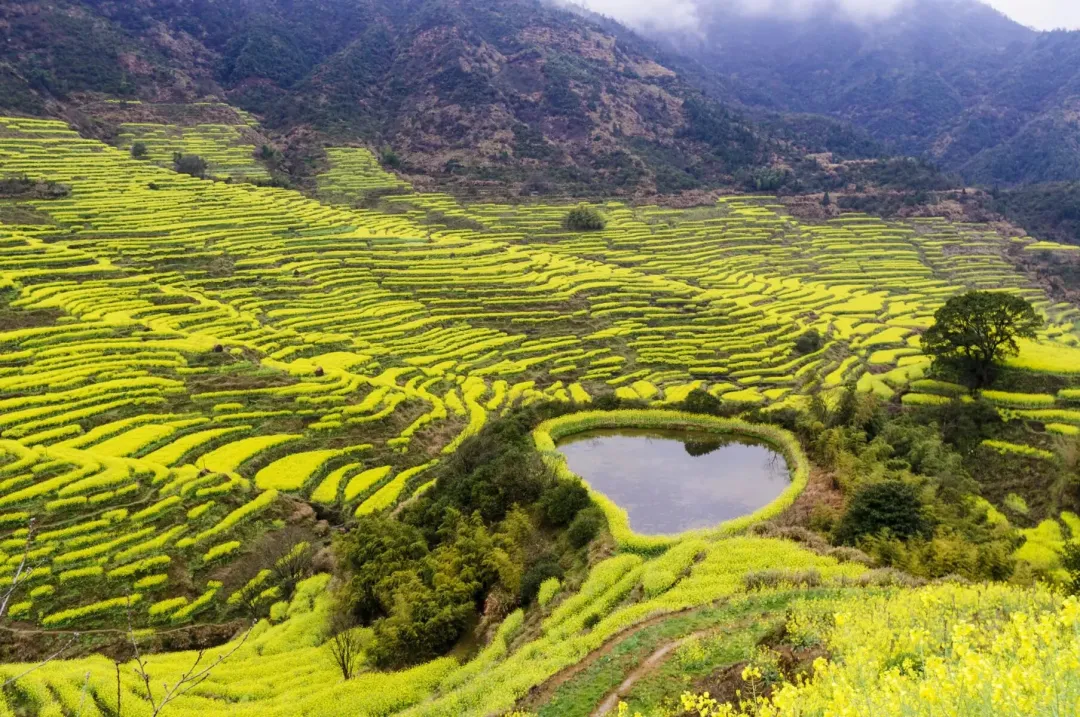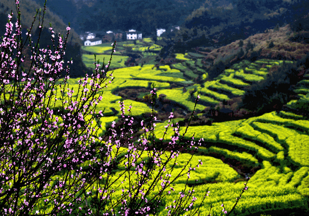 山崖上的古民居村、屋顶上的晒秋美景青山向晚盈轩翠,碧水含春傍槛流。周边梯田覆叠,白云环绕。被称为“梯云人家”。