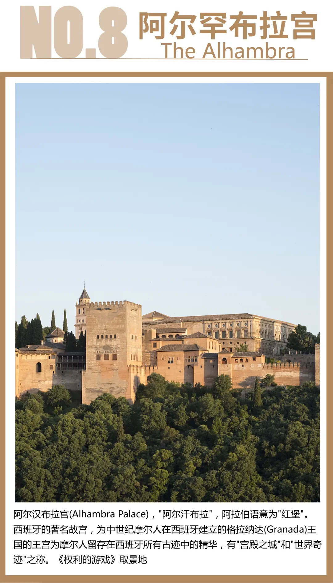 阿尔罕布拉宫是中世纪摩尔人在西班牙建立的格拉纳达王国的王宫。是摩尔人在西班牙留下的建筑精华,那独具伊斯兰风格的装饰建筑让每个到过这里的人无不惊叹,也是许多影视剧热捧的拍摄地, 比如大家熟知的美剧《权力的游戏 珍品的展览! |