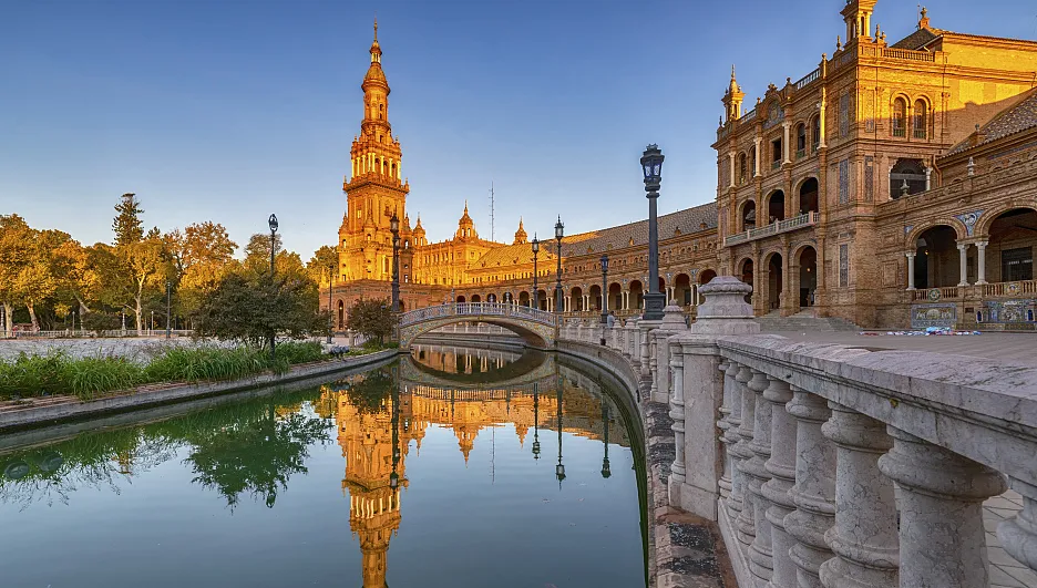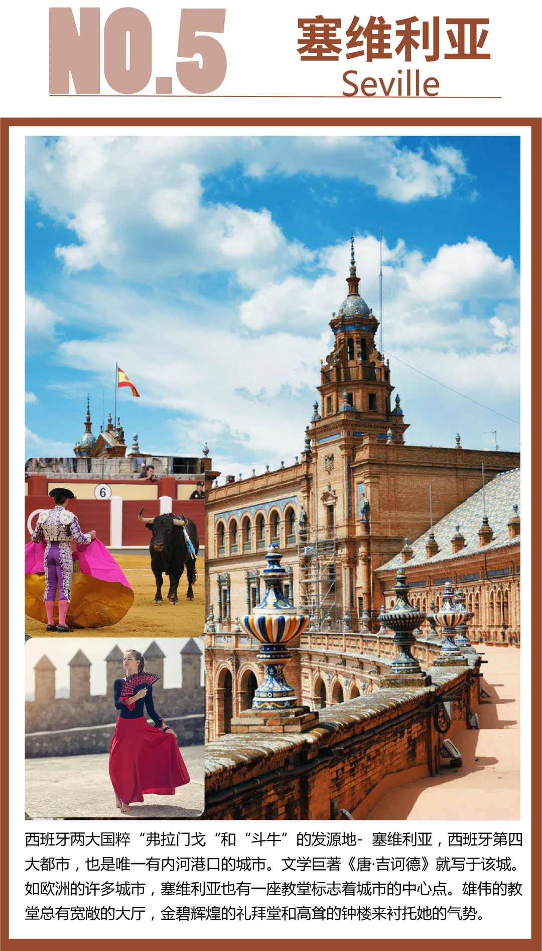 【塞维利亚】(1987年被列入世界文化遗产)塞维利亚为卡门故乡、美丽的安达卢西亚大区首府。也是传统艺术佛拉明戈舞和斗牛的发源地。无论是奔放的弗拉门戈舞步还是斗牛这项属于勇士的运动,都可以让游客随时感受到西班牙人对生活的热枕和对自由的向往。