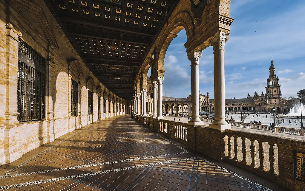 【西班牙广场】是塞维利亚的标志性建筑,摩尔复兴建筑的缩影。连续不断的红砖建筑环绕着广场边缘,广场中心是一个大喷泉。广场上也可以看到西班牙不同的建筑风格,包括哥特风格,摩尔风格以及银匠风格。