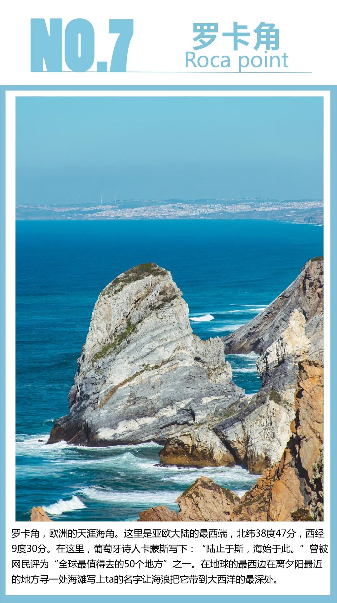 罗卡角是整个欧亚大陆的最西点。人们在罗卡角的山崖上建了一座灯塔和一个面向大洋的十字架。碑上以葡萄牙语写有著名的一句话:“陆止于此、海始于斯”(Onde a terra acaba e o mar começa)。罗卡角曾被网民评为“全球最值得去的50个地方”之一。 |