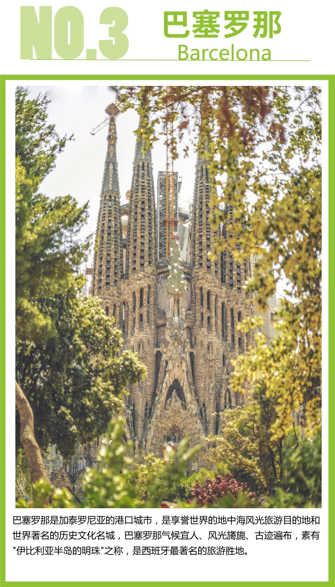 【巴塞罗那】人们往往将巴塞罗那和三个关键词相连:度假、建筑、体育。爱度假的游客爱这里宜人的地中海气候、绵延的海滩、灿烂的阳光;建筑爱好者称之为天堂,高迪的惊世之作赋予了她这样独特的魅力;球迷更是爱她的动感、狂野、激情澎湃。她就是利比里亚半岛的明珠,一个让人到了就不想走的城市。