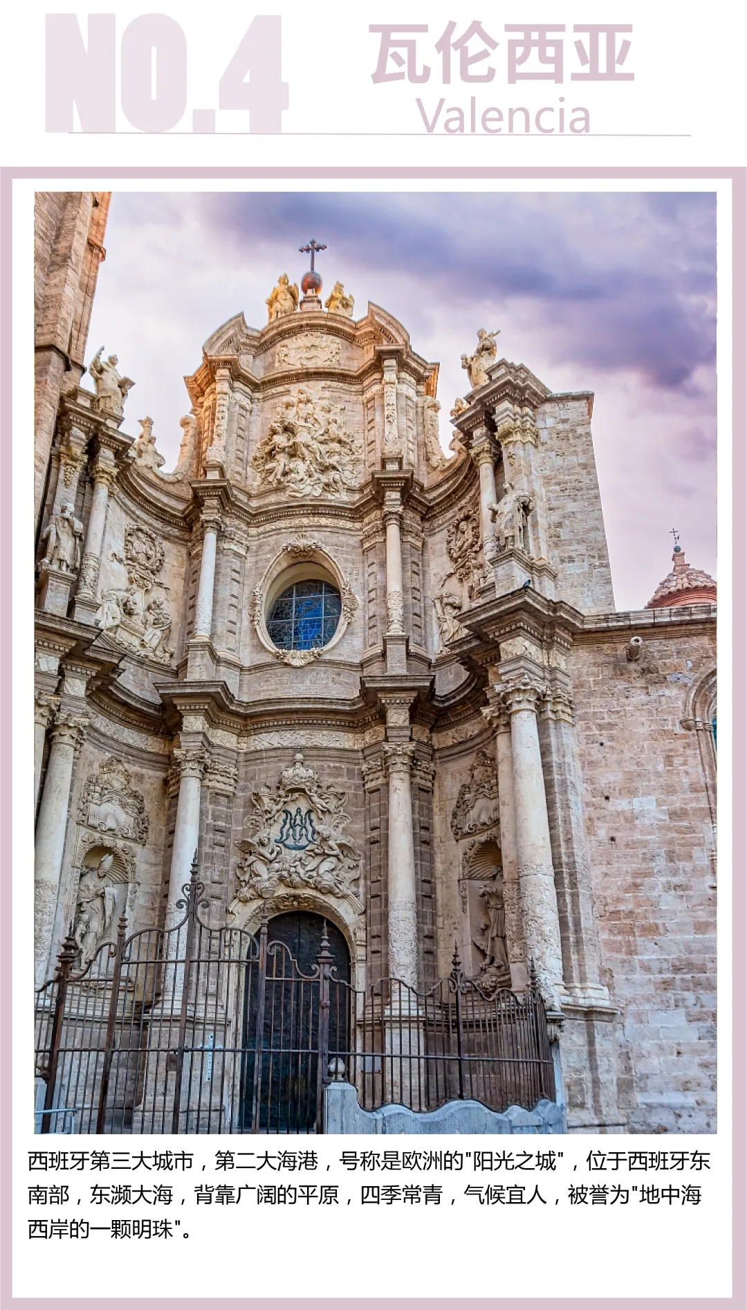 【瓦伦西亚】(1996年被列入世界文化遗产)(观光时间不少于1.5小时)号称欧洲的“阳光之城”。东濒大海,背靠广阔的平原,四季气候宜人。老城区依然保持着古香古色的风貌,著名的主教堂、市政厅、中央市场、丝绸交易市场、圣女广场等景点都集中于此。拥有美丽的海滩,每年300天的充足光照。
