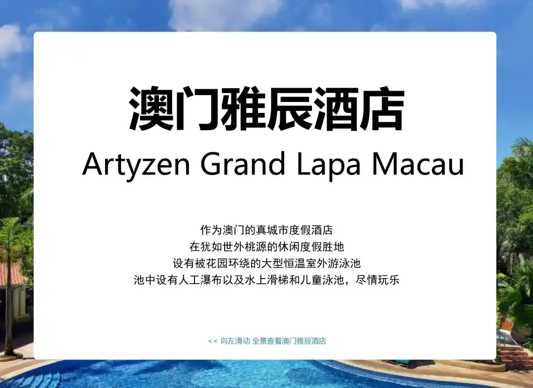 以精品生活及都市度假盛名的澳门雅辰酒店位于澳门中心地段,紧邻世界遗产景点,是您领略小城故事及文化底蕴的一扇窗。酒店英文名“Artyzen Grand Lapa”,灵感源自里斯本著名的名人聚居地拉帕社区 (Lapa)。酒店内的艺术、文化、美食和建筑率先带您领略充满活力且风情万种的澳门。