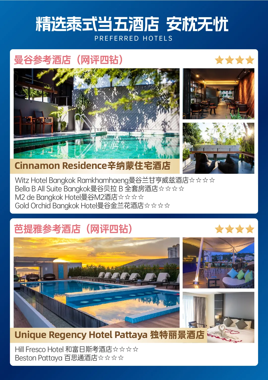 全程酒店住宿均为双人标准间。如参团时出现单男单女,则以加床或补单房差为准。