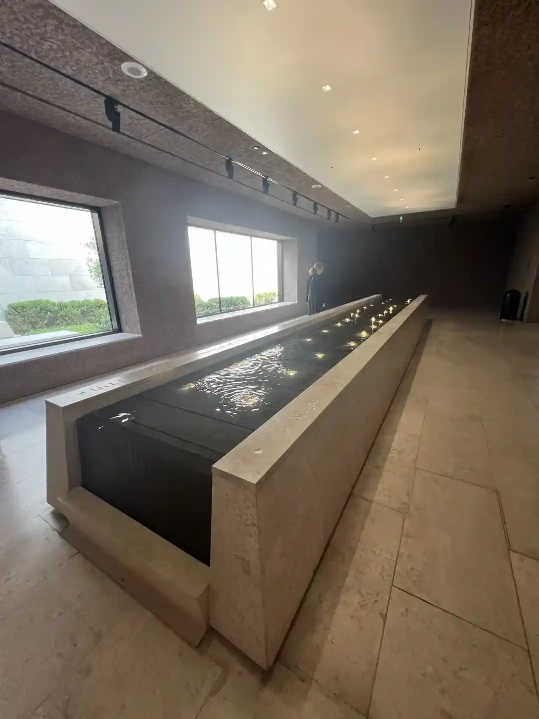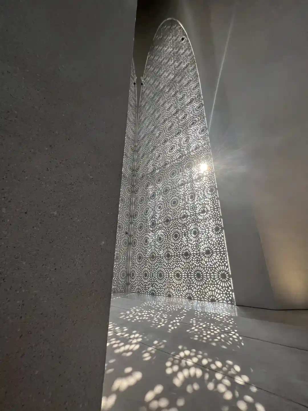 四个无缝的整体柱子代表了伊斯兰教的稳定、秩序和丰满的概念,并创造了一个拱形空间,将游客引向米哈拉布。犹太教堂的bema面向耶路撒冷,一系列的V形柱子组合在一起,在室内和室外之间形成了一个屏障,这个造型灵感来自于犹太人住棚节期间使用的住棚节上重叠的棕榈叶层。一个象征着原始帐篷的青铜网状会幕从天花板的天窗上倾泻而下,笼罩在会众上方。