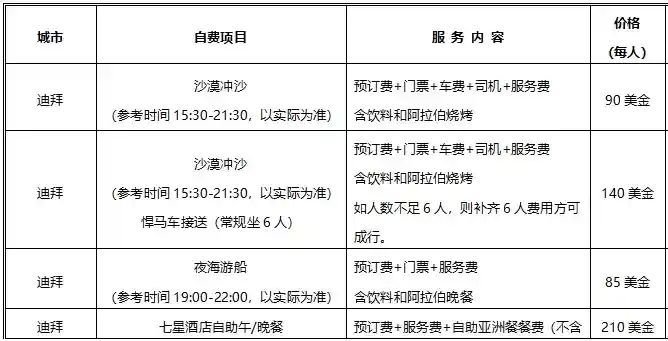 备注:所有自费项目均是推荐或建议性项目,客人应本着“自愿自费”的原则酌情参加,导游组织自费活动将不会带有任何强迫因素。部分项目参加人数不足时,则费用将做相应调整或无法成行。