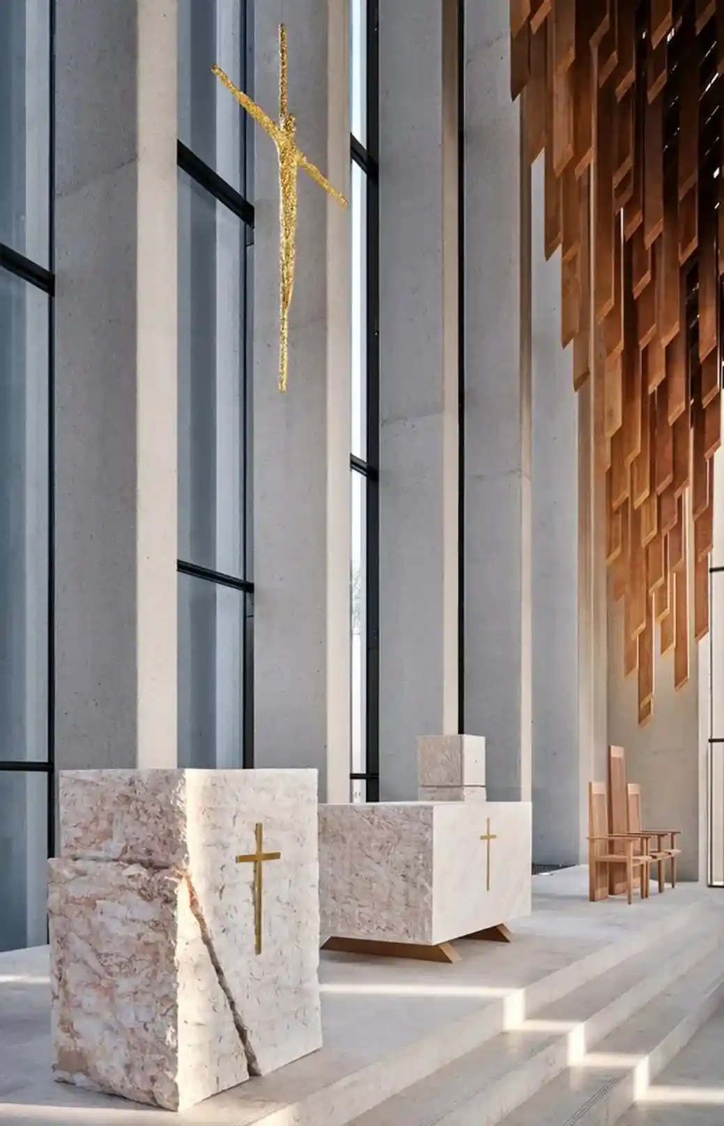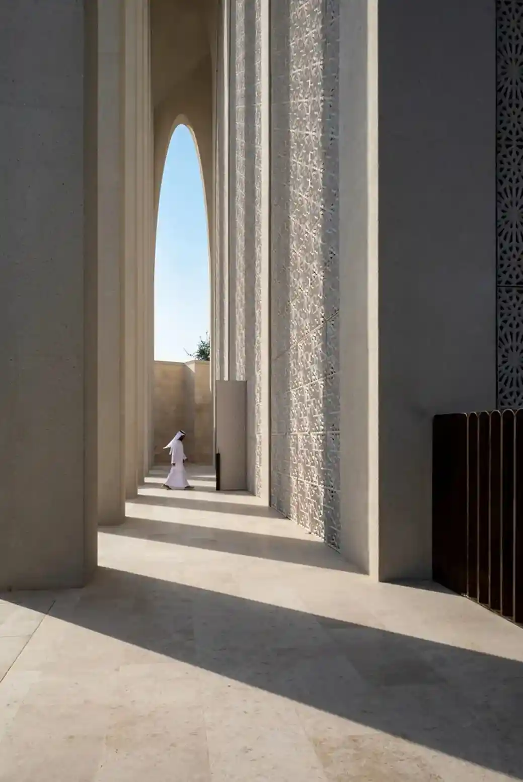 一堵石墙包围着基座,方舟坐落在基座上,与Adjaye Associates事务所设计的以V形图案为特色的橡木座椅一起,面朝诵经台。基督教堂的祭坛将在日出时指向东方,入口处密布着大量立柱,光线从中间穿过时构成美妙的光影穿插感。将向游客展示与与每个信仰的实践和传统相关的设计特征。