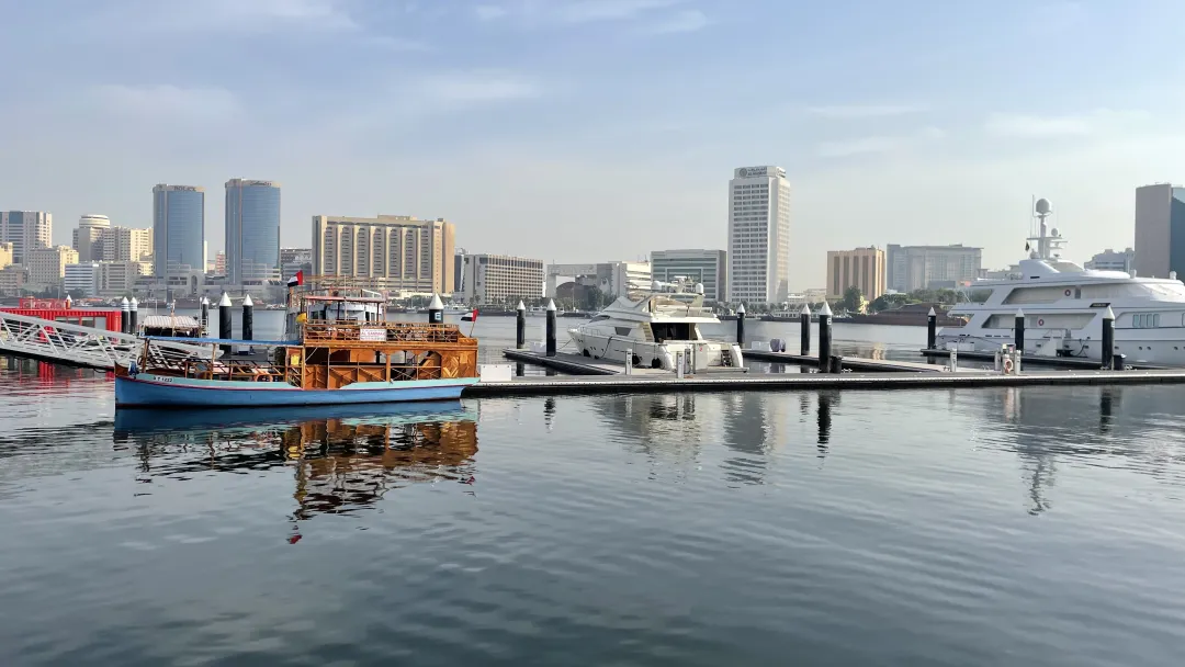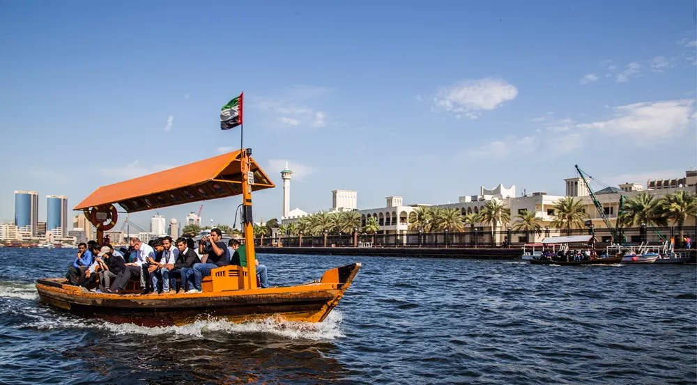 随后乘坐传统【水上的士】(乘船时间约10分钟)游览迪拜河, 水上的士在阿拉伯语中叫做“Abra”,Abra跨过迪拜母亲河Creek,游览迪拜海沟咸水湾;