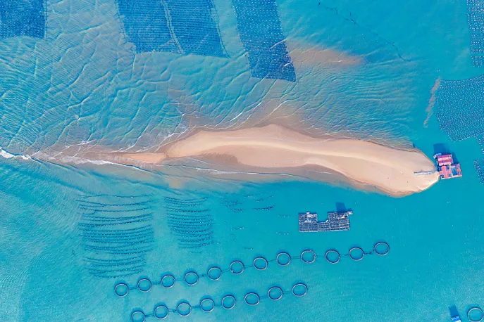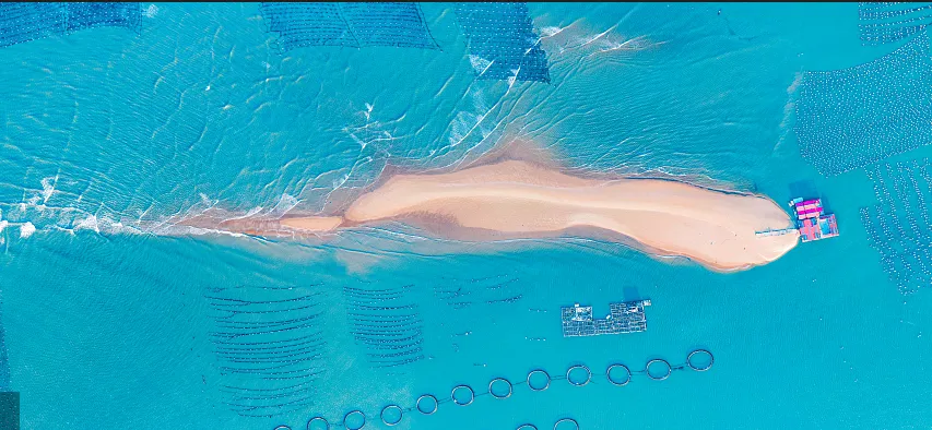 鱼骨沙洲,风景绝美但却相当低调,退潮后大海中间会出现一个像鱼骨形状的沙滩。这里阳光灿烂、天蓝云白、海水清澈,鱼排点缀其中,白鹭成群飞翔于海之上,美的无与伦比。而且这里还有上千的鱼排,非常壮观。