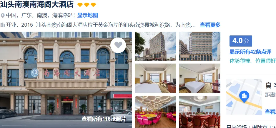 南澳岛:世纪酒店海景、南海阁海景房或同级