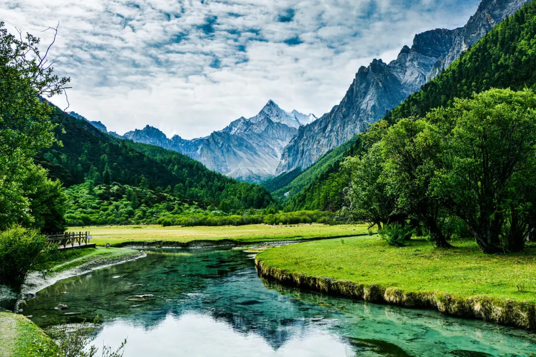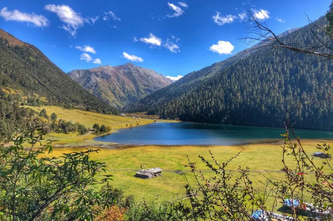 前往【洛绒牛场】(约15分钟),洛绒牛场是附近村民放牧的高山牧场,被“日松贡布”三座神山环绕,贡嘎河从草场穿梭,林间溪流潺潺,与牧场木屋交相辉映,构成了一幅原始而又迷人的景色,令人们进入返朴归真的境界。 5月时草长鹰飞,风吹草低现牦牛,又背靠三座神山【仙乃日神山】(意为观世音菩萨,海拔6032米)、【央迈勇神山】(意为文殊菩萨,海拔5958 米)、【夏诺多吉神山】(意为金刚手菩萨,海拔5958米),是观看三座雪山的最好地点。雪峰、森林、草场、溪流、湖泊、瀑布和牧场木屋相映成趣。体验人和自然和谐相处的天然妙趣。洛绒牛场也是通往五色海、牛奶海的必经之地。